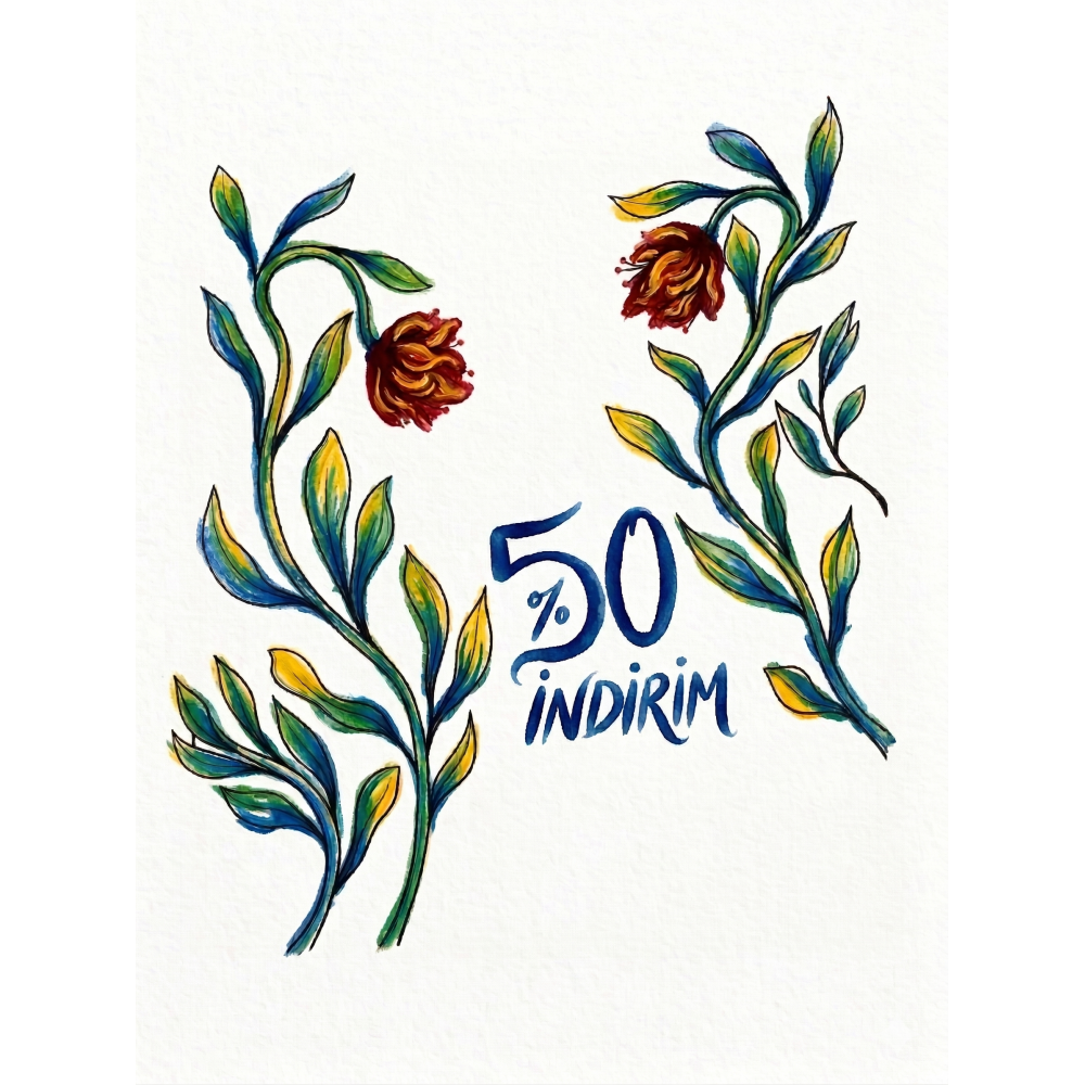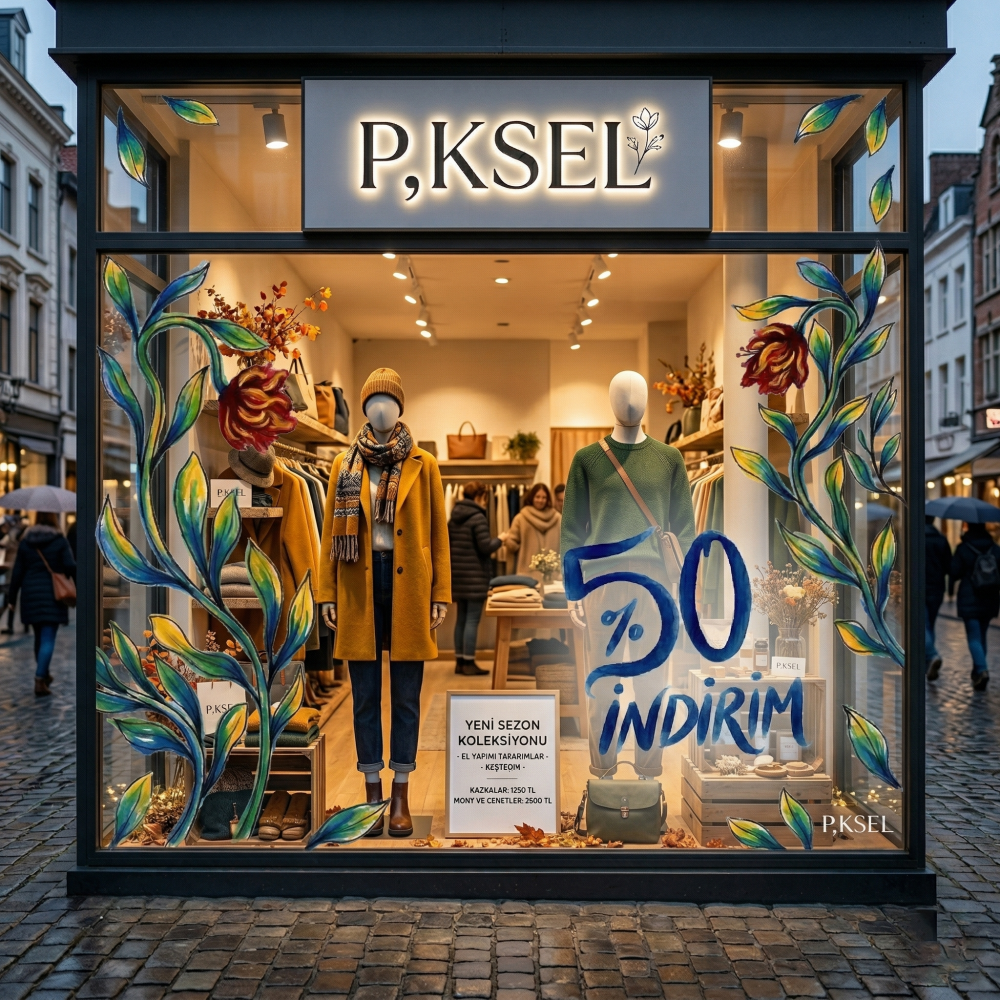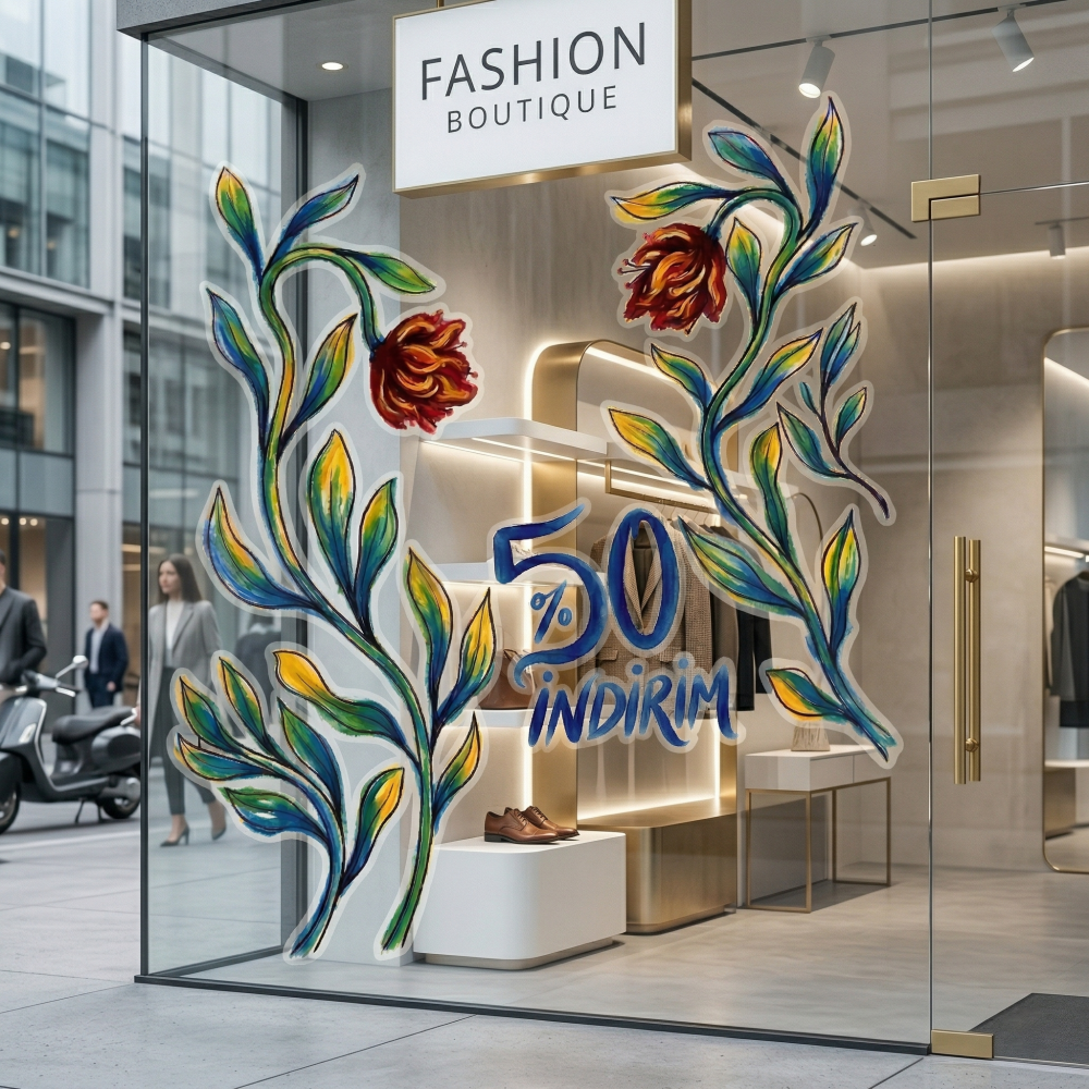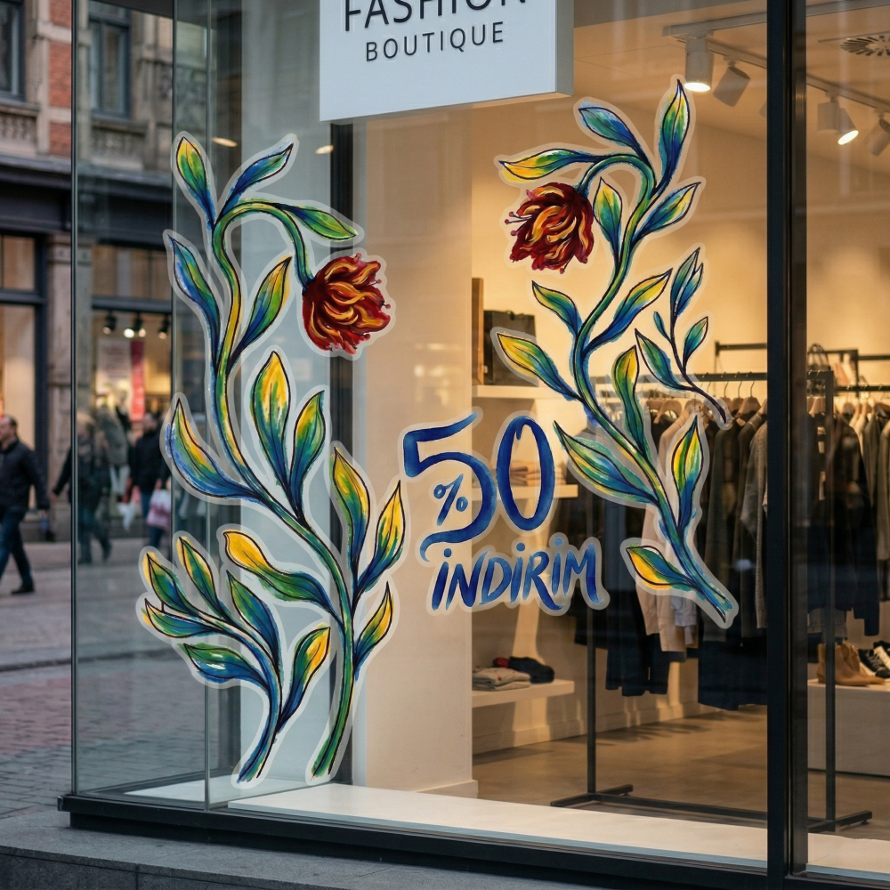 Çiçek Tasarım Vitrin Cam Sticker – %50 İndirim Yazısı & Dekoratif Cam Vitrin Sticker