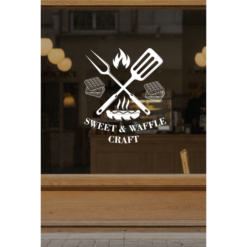 Kafe & Tatlıcı Cam Vitrin Sticker – Sweet & Waffle Yazısı Dekor Tasarımı - Waffle ve Tatlı Temalı Dekor