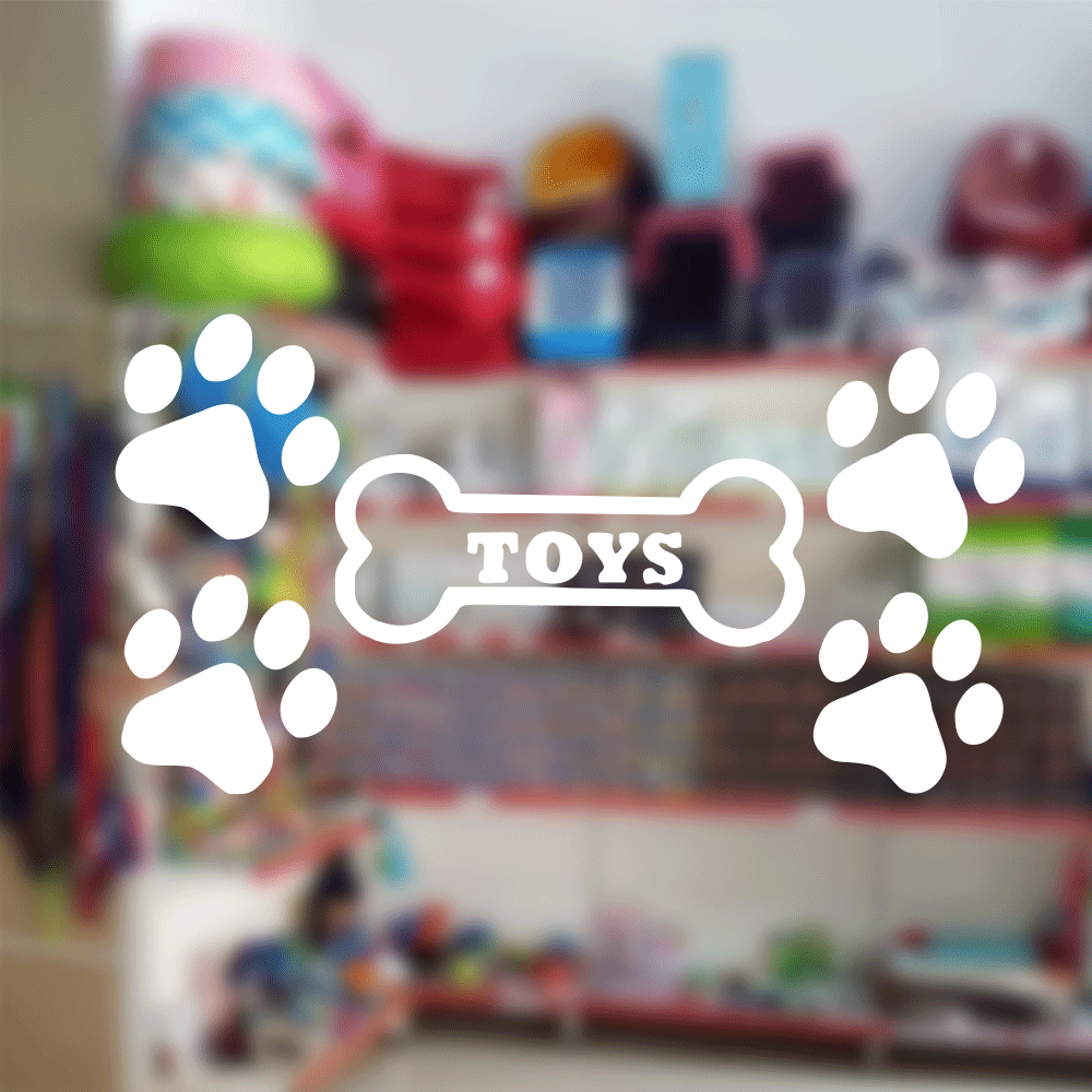 “Kemik” şeklindeki oyuncak figürleriyle tasarlanmış bu sticker, petshop ve veteriner kliniklerinde oyuncak ve aksesuar reyonlarını öne çıkarmak için ideal bir dekorasyondur.
