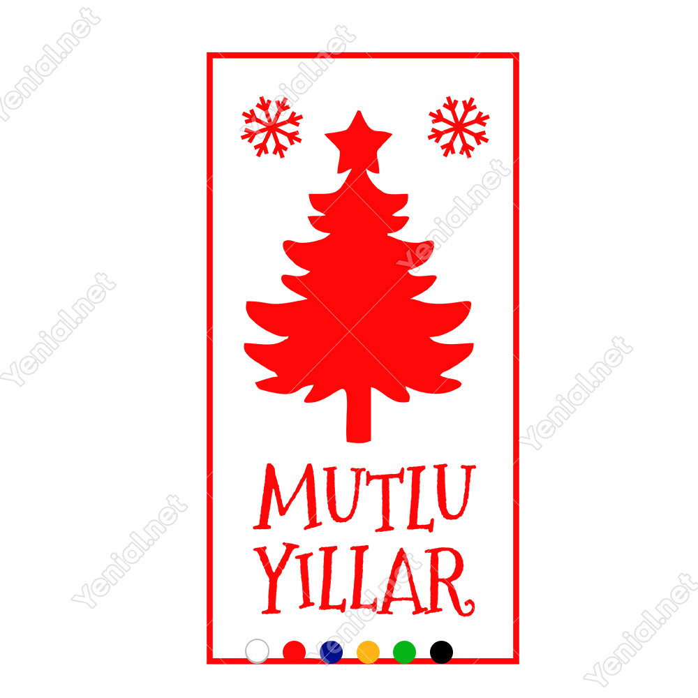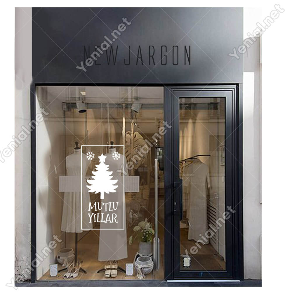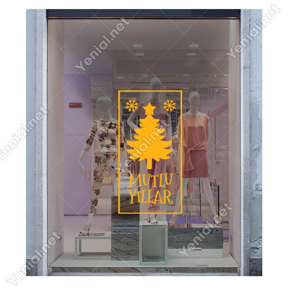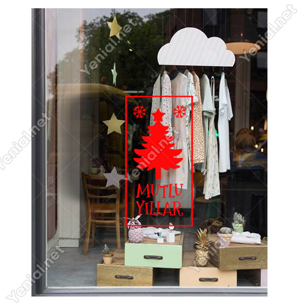 Üstünde Parlak Yıldız Bulunan Çam Ağacı ve Mutlu Yıllar Yazısı Yılbaşı Süslemeleri