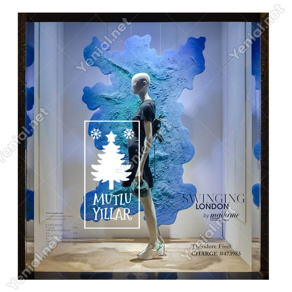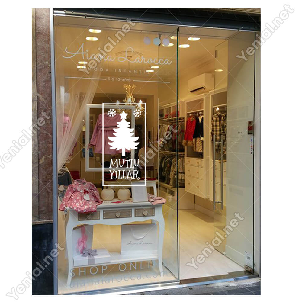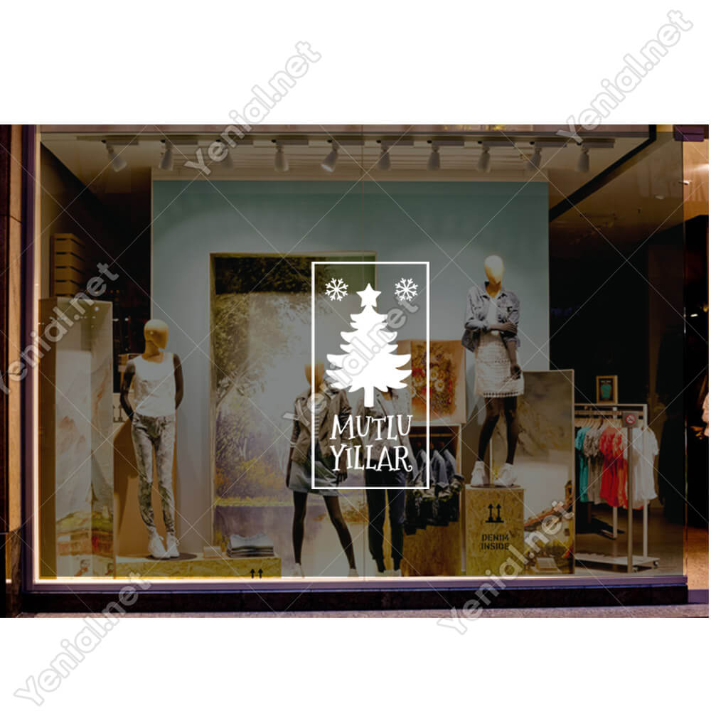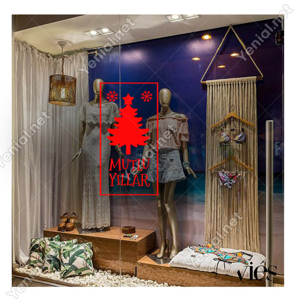 Üstünde Parlak Yıldız Bulunan Çam Ağacı ve Mutlu Yıllar Yazısı Yılbaşı Süslemeleri